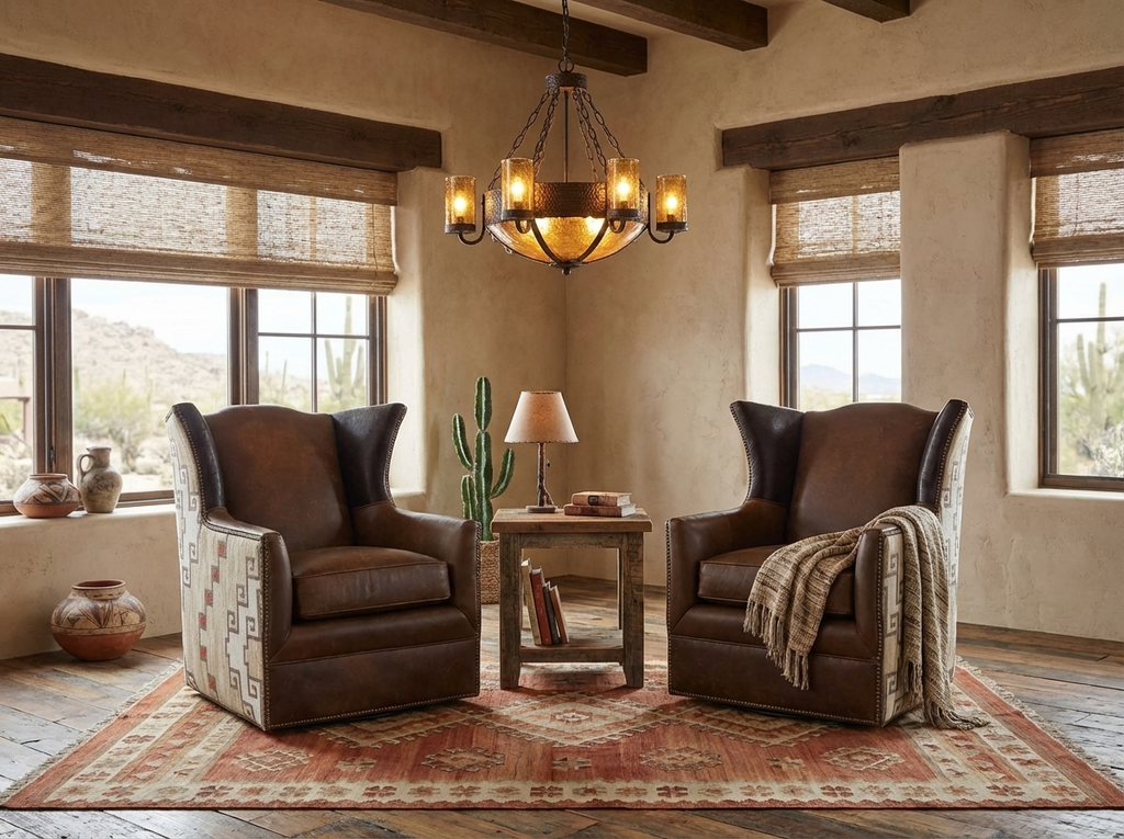 We do love a swivel chair. They’re great for a fidgety teen and they’re the solution to the issue with open-plan living areas, when you want to be watching the game but also talking to someone in the kitchen. King Hickory’s Athens Chair is a tall wing-back chair — incredibly comfy, you could fall asleep in this one — replete with interesting details such as leather piping, brass tacks and contrasting fabrics. This chair has a leather seat, back and arms, hair-on-hide inside the wings and a patterned fabric (shown here with the Southwestern-inspired Keehan Adobe) on the outside.