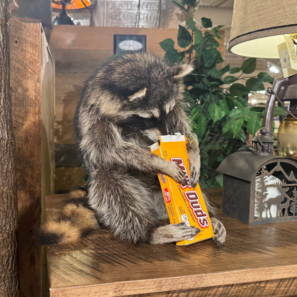 This playful raccoon taxidermy captures a charming moment of nature indulging in a sweet treat, candy Milk Duds. Perfect for adding a whimsical touch to your decor, it makes a delightful conversation piece that highlights the unexpected joys found in everyday life. Ideal for collectors or as a unique decorative accent.