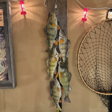 This 5 Perch Stringer features five taxidermy perch already mounted and secured on a stringer, ready to hang on your wall. Designed for easy display, it offers a convenient and attractive way to showcase your perch collection without additional mounting work. Perfect for hunting enthusiasts looking to create an organized, wall-mounted presentation.