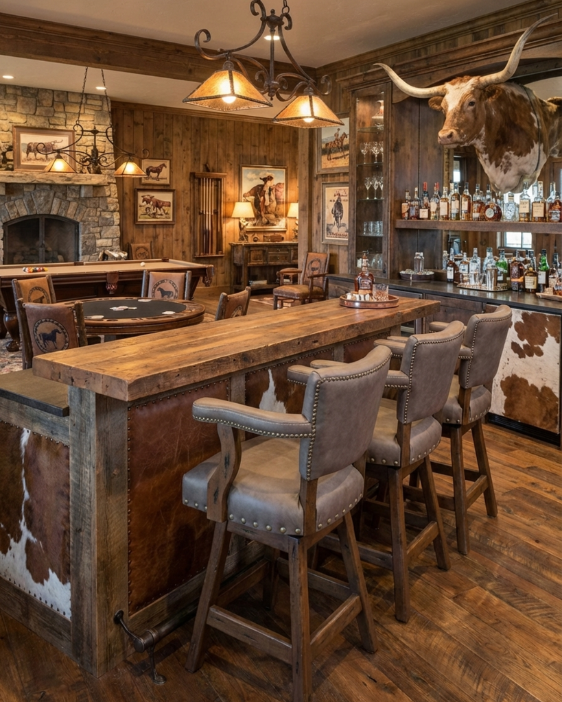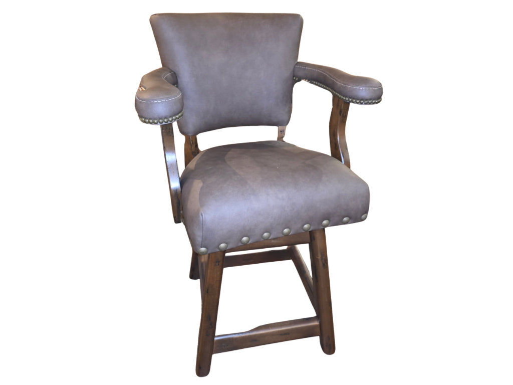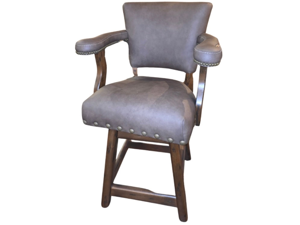 Introducing the Ranch 26" Counter Stool Collection—a set of four Western-inspired seating pieces that marry rustic charm with refined elegance. Each stool features premium genuine leather upholstery with natural variations that develop character over time, complemented by a hand-finished solid wood base. The thoughtfully designed silhouette includes a supportive backrest, cushioned arms, and signature decorative nailhead detailing that speaks to superior craftsmanship. Perfect for elevated kitchen islands, bar counters, or lodge-style dining areas, these stools deliver both comfort and enduring style.