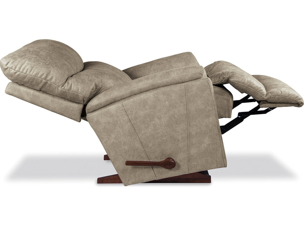 An updated silhouette, complete with slightly flared arms and a sleek tall back give Trouper a look that’s fresh and contemporary. It’s also one comfortable recliner. The sculpted bucket seat cradles you in softness while the padded split back provides superb head and lumbar support. Simply use the convenient handle on the outside arm to raise the legrest for reading, relaxing or watching TV. When you’re not reclining, it’s a relaxing rocker with a smooth, graceful motion.