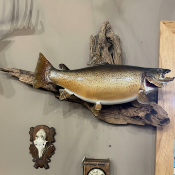 This vintage brown trout wall mount captures the natural beauty and detail of the iconic species, making it a striking decor piece for any fishing enthusiast or nature lover. Expertly crafted to showcase the trout’s distinct coloring and lifelike appearance, it adds a rustic, authentic touch to your space. Perfect for displaying in cabins, living rooms, or offices, this mount serves as both a conversation starter and a tribute to outdoor adventures.